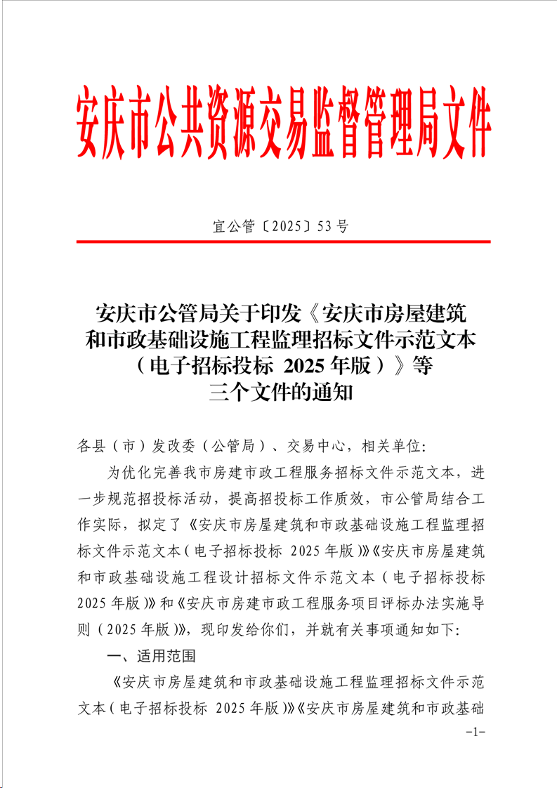 安慶市公管局關(guān)于印發(fā)《安慶市房屋建筑和市政基礎(chǔ)設(shè)施工程監(jiān)理招標(biāo)文件示范文本(電子招標(biāo)投標(biāo) 2025年版)》等三個(gè)文件的通知